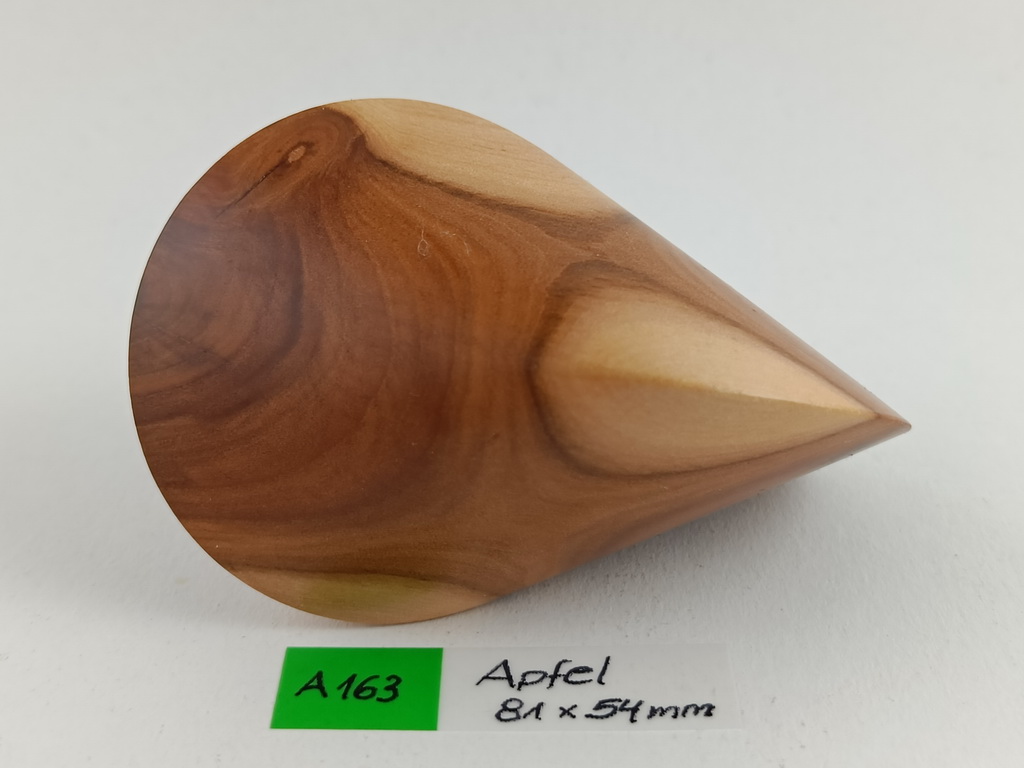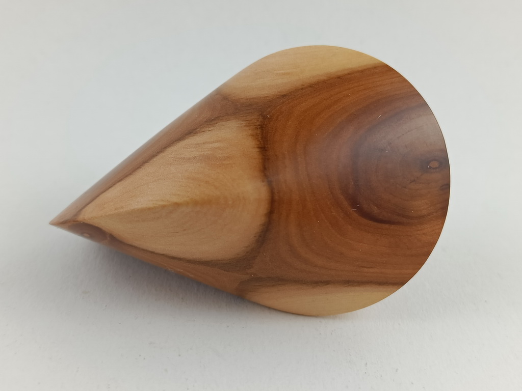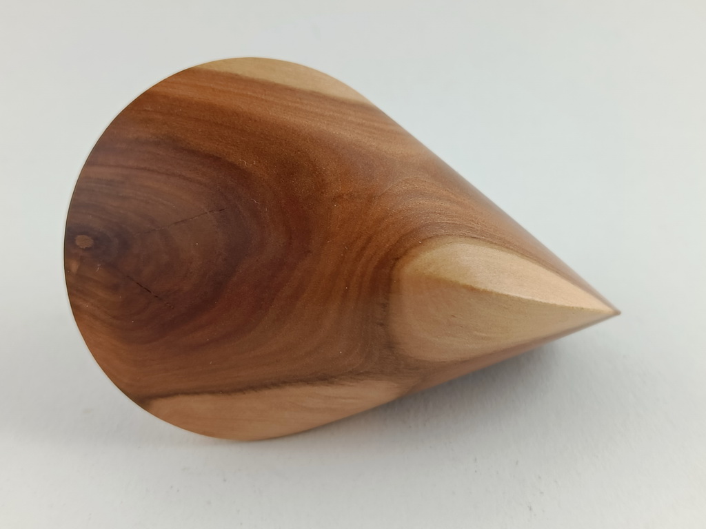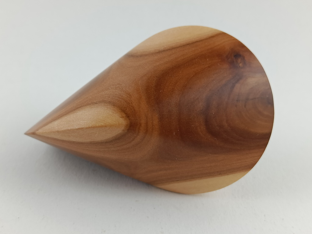 Das oben gezeigte Oloid ist ein Einzelstück und kann wegen der einzigartigen Merkmale des Holzes nur einmal in dieser abgebildeten Art hergestellt und verkauft werden. Kleinere Trocknungsrisschen um den Kernholzbereich wurden stabilisiert.