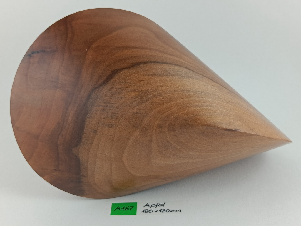 Dieses Apfelholzoloid ist ein Unikat. Verkauft wird genau das auf den Bildern gezeigte Oloid. Es wurde in mühevoller Handarbeit aus einem ganz besonderen großen und rissfreiem Stück Apfelholz herausgearbeitet. Von groben Holzarbeiten mit der Säge weiter über verschiedene Schleifvorgänge bis hin zu einem Endschliff mit einer 1000er Körnung erfolgte das Finish mit dem Polierfilz. Für den Schutz werden ein Naturöl und Hartwachs verwendet.