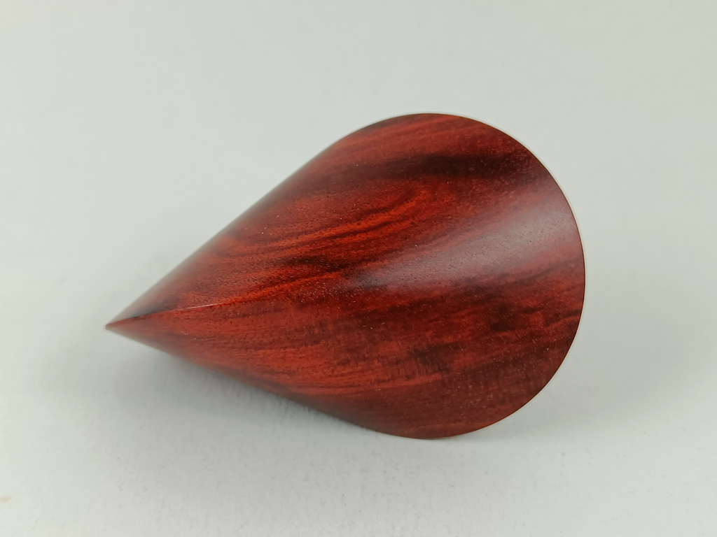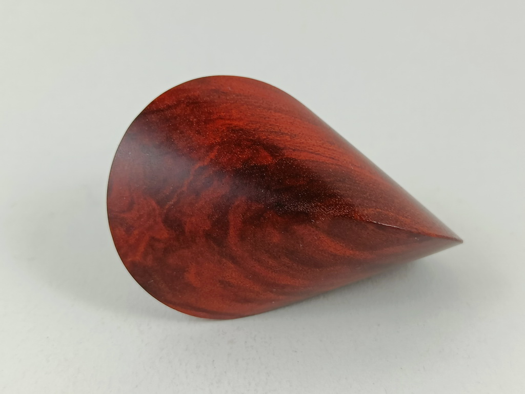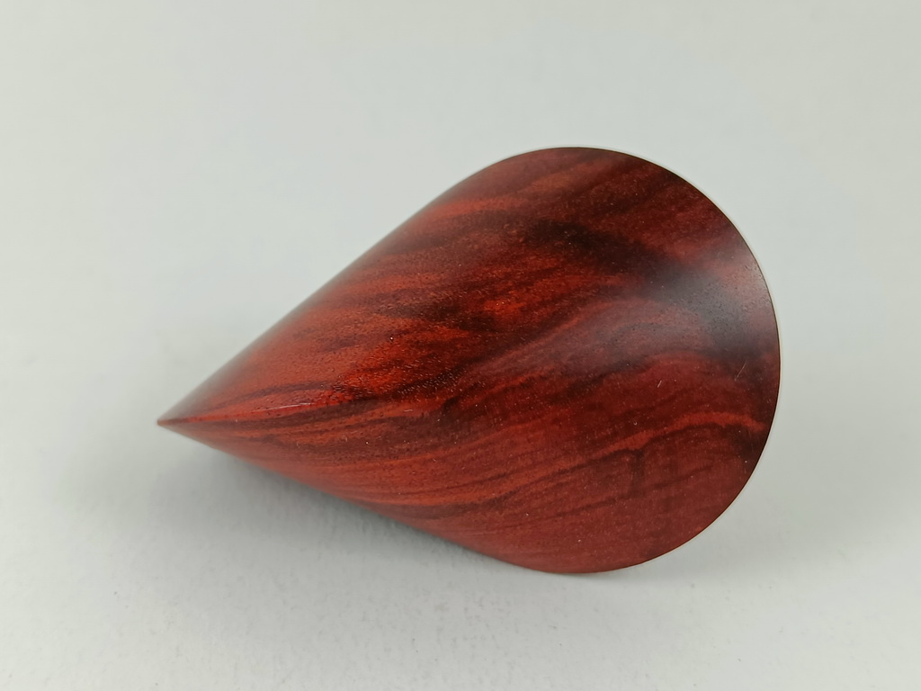 Dieses Chakte-Kokholzoloid ist ein Unikat. Verkauft wird genau das auf den Bildern gezeigte Oloid. Es wurde in mühevoller Handarbeit aus einem ganz besonderen Stück Chakte-Kok- oder Red-Heartholz herausgearbeitet. Von groben Holzarbeiten mit der Säge weiter über verschiedene Schleifvorgänge bis hin zu einem Endschliff mit einer 1000er Körnung erfolgte das Finish mit dem Polierfilz. Für den Schutz werden ein Naturöl und Hartwachs verwendet.