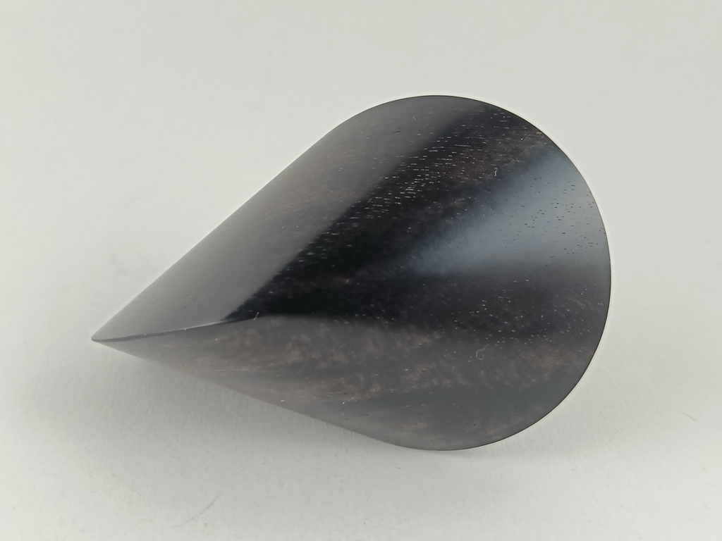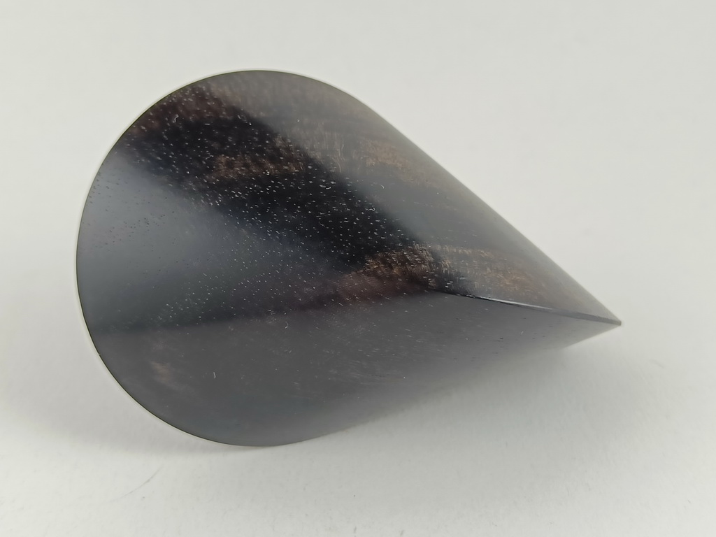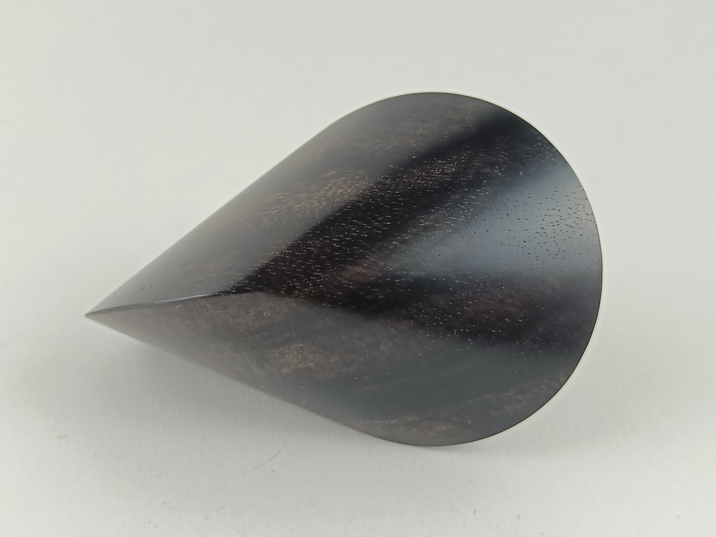 Dieses Ebenholzoloid ist ein Unikat. Verkauft wird genau das auf den Bildern gezeigte Oloid. Es wurde in mühevoller Handarbeit aus einem ganz besonderen Stück Ebenholz herausgearbeitet. Von groben Holzarbeiten mit der Säge weiter über verschiedene Schleifvorgänge bis hin zu einem Endschliff  mit einer 1000er Körnung erfolgte das Finish mit dem Polierfilz. Für den Schutz werden ein Naturöl und Hartwachs verwendet.