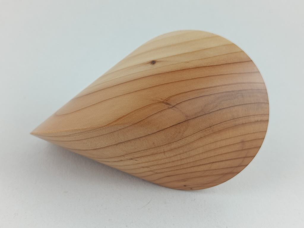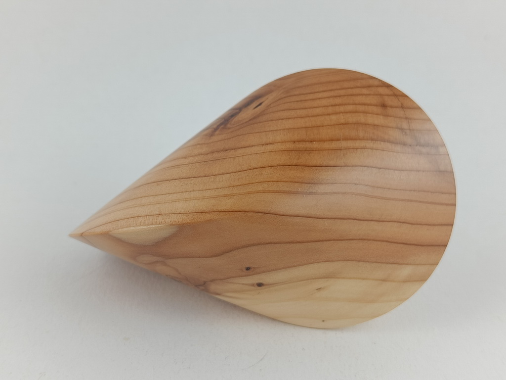 Dieses Eibenholzoloid ist ein Unikat. Verkauft wird genau das auf den Bildern gezeigte Oloid. Es wurde in mühevoller Handarbeit aus einem ganz besonderen Stück Eibenholz herausgearbeitet. Von groben Holzarbeiten mit der Säge weiter über verschiedene Schleifvorgänge bis hin zu einem Endschliff mit einer 1000er Körnung erfolgte das Finish mit dem Polierfilz. Für den Schutz werden ein Naturöl und Hartwachs verwendet.
