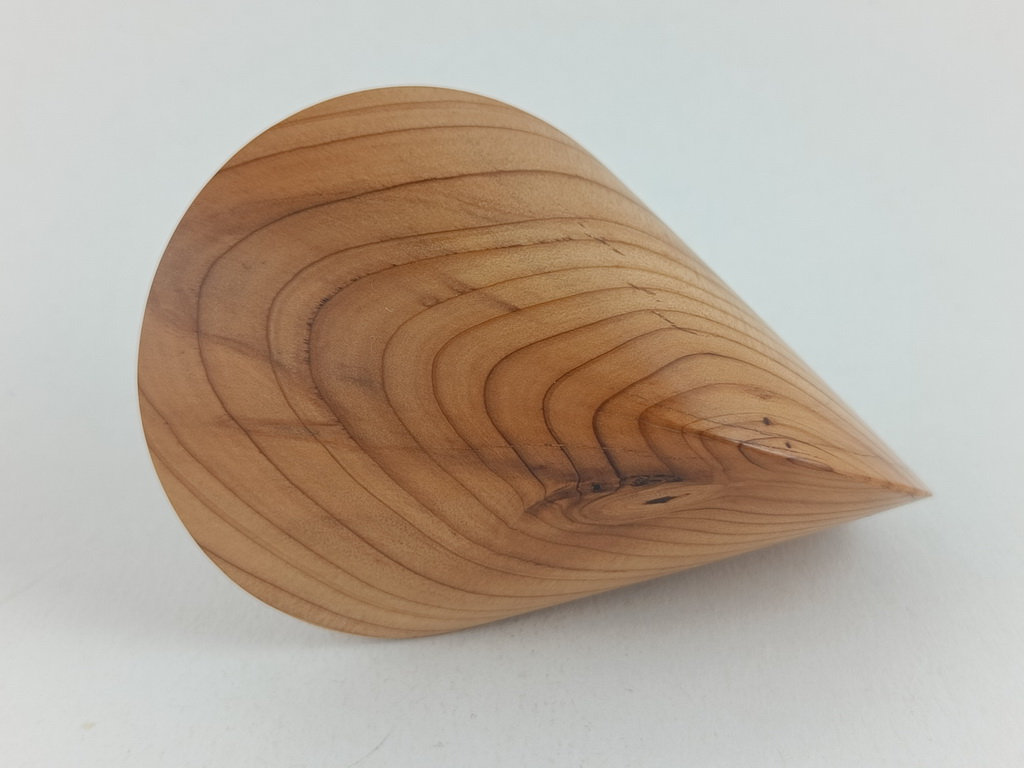 Das oben gezeigte Oloid ist ein Einzelstück und kann wegen der einzigartigen Merkmale des Holzes nur einmal in dieser abgebildeten Art hergestellt und verkauft werden. Beim Schleifen haben sich kleinere Trocknungsrisschen gezeigt, welche stabilisiert wurden. Eigentlich zu schade zum Verbrennen. Daher wird das Oloid als 2. Wahl im Preis reduziert angeboten.