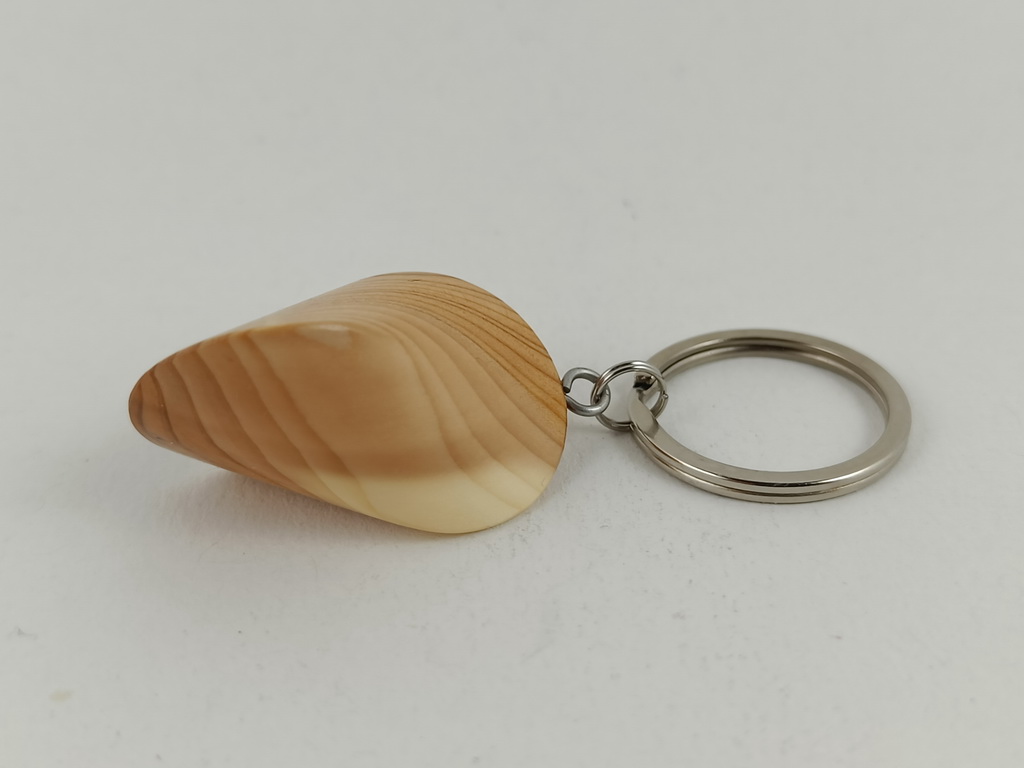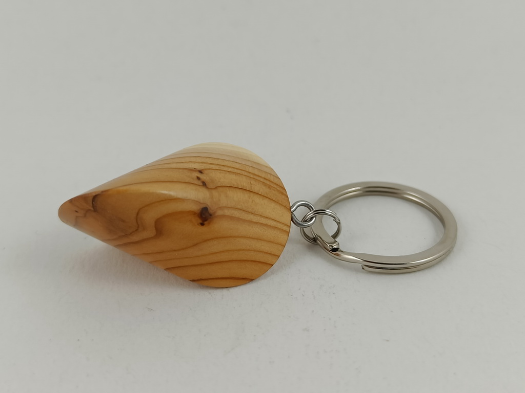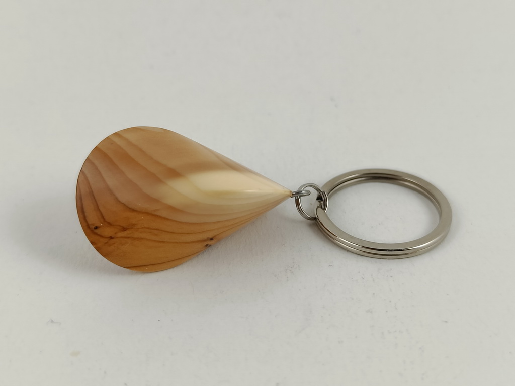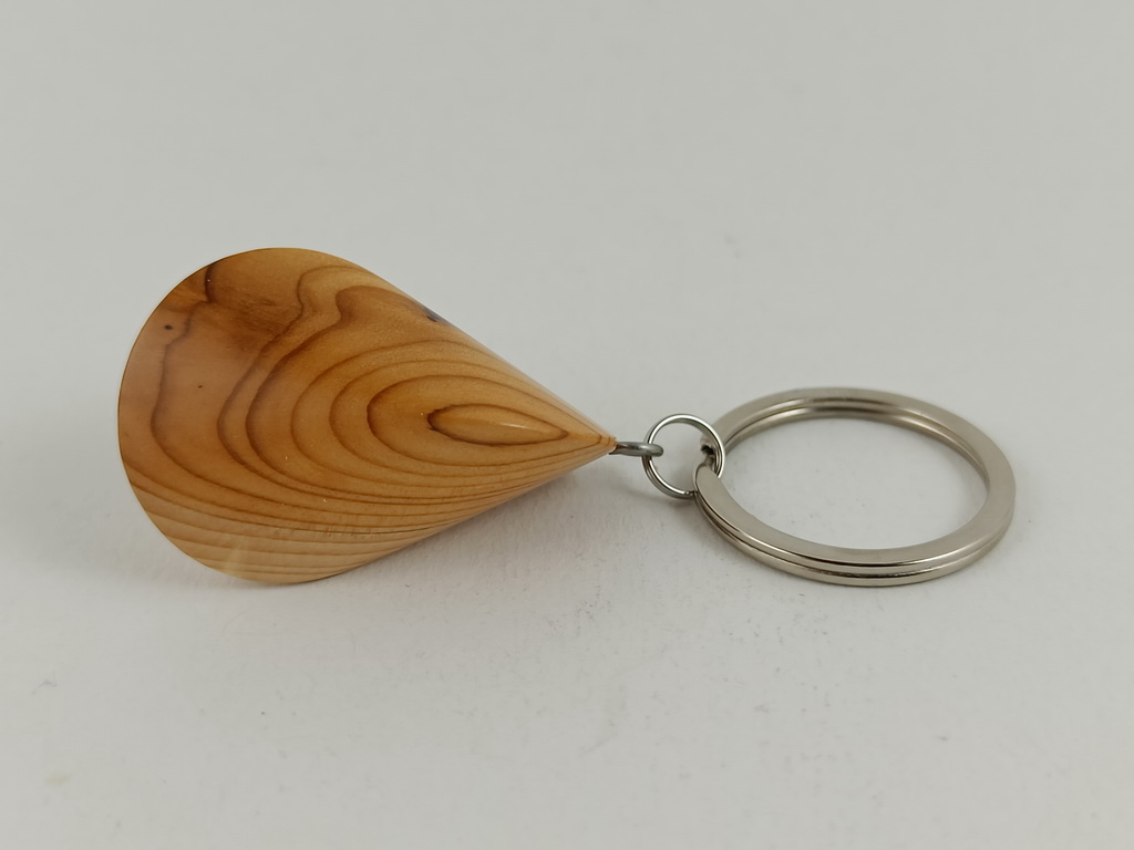 Dieses Eibenholzoloid, ausgeführt als Schlüsselanhänger, ist ein Unikat. Verkauft wird genau der auf den Bildern gezeigte Oloid-Schlüsselanhänger. Er wurde in mühevoller Handarbeit aus einem besonderen Stück Eibenholz herausgearbeitet und zu diesem Produkt vollendet.