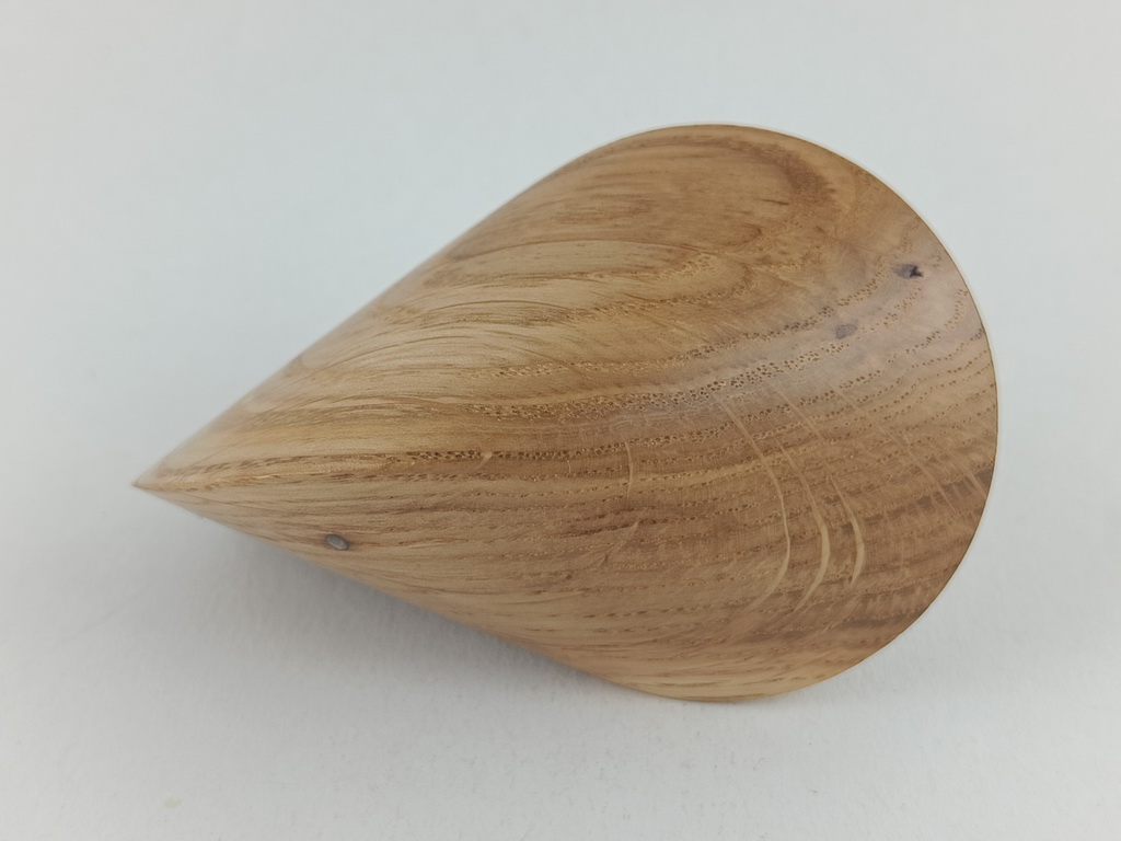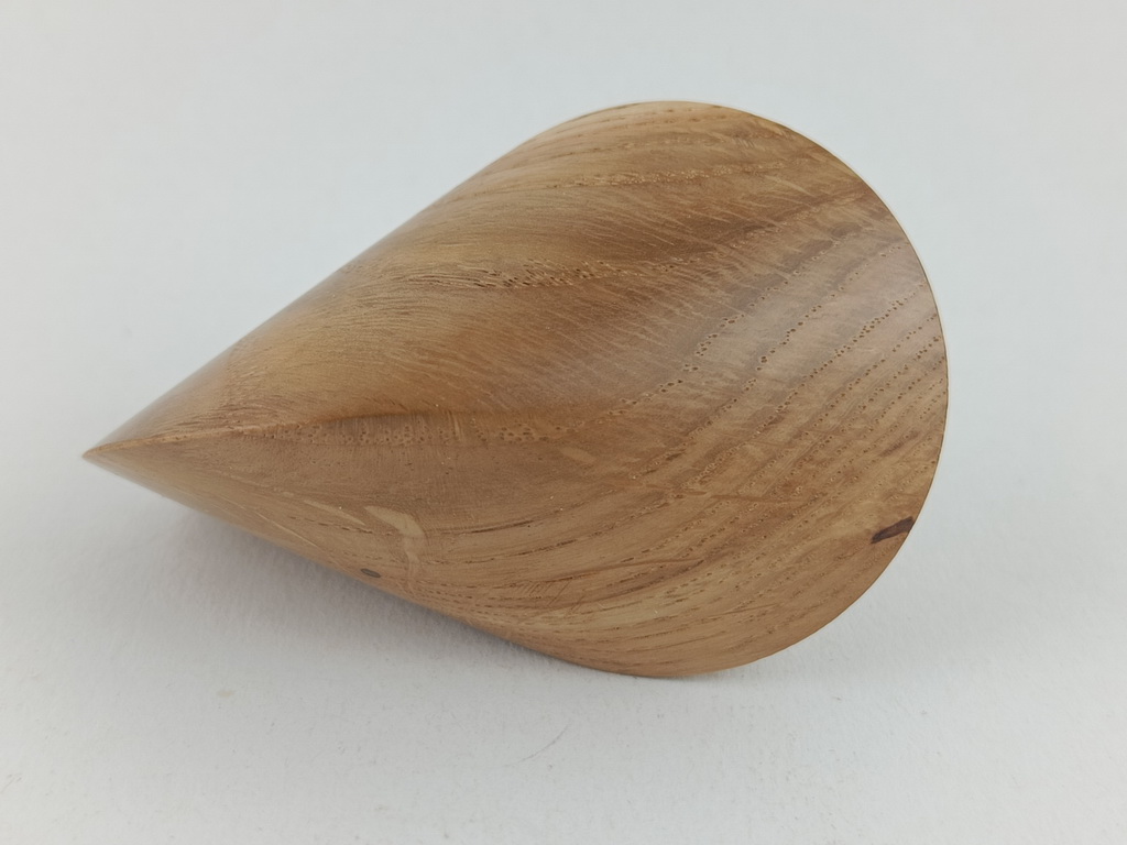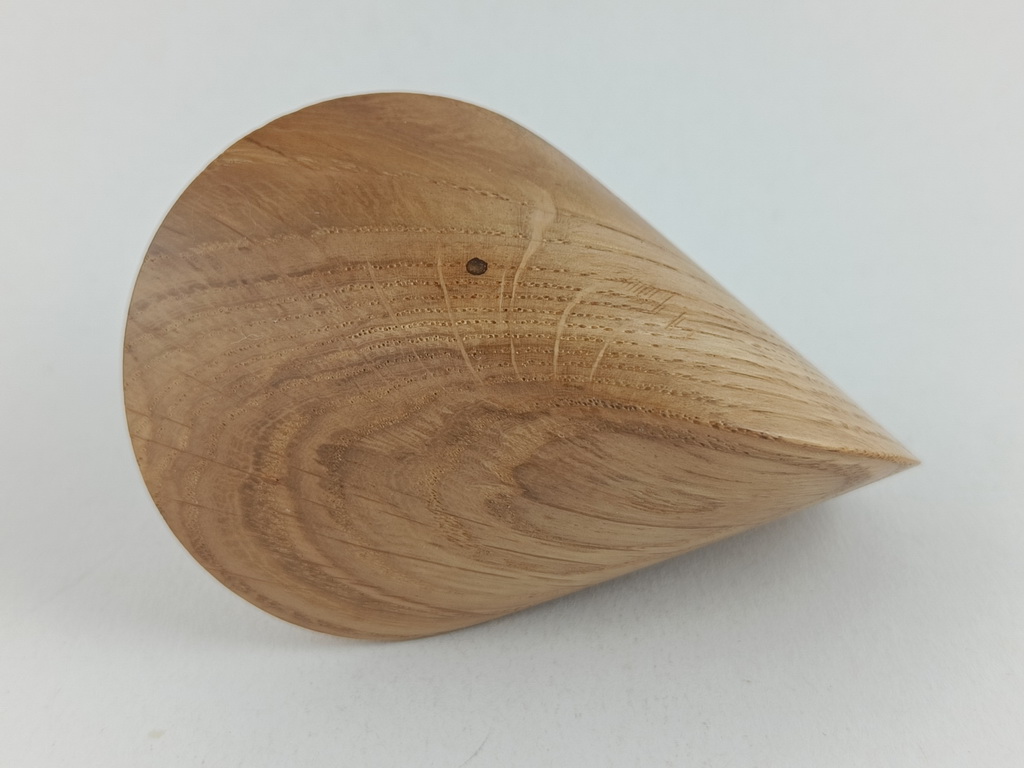 Dieses Eichenholzoloid ist ein Unikat. Verkauft wird genau das auf den Bildern gezeigte Oloid. Es wurde in mühevoller Handarbeit aus einem ganz besonderen Stück Eichenholz herausgearbeitet. Von groben Holzarbeiten mit der Säge weiter über verschiedene Schleifvorgänge bis hin zu einem Endschliff mit einer 1000er Körnung erfolgte das Finish mit dem Polierfilz. Für den Schutz werden ein Naturöl und Hartwachs verwendet.