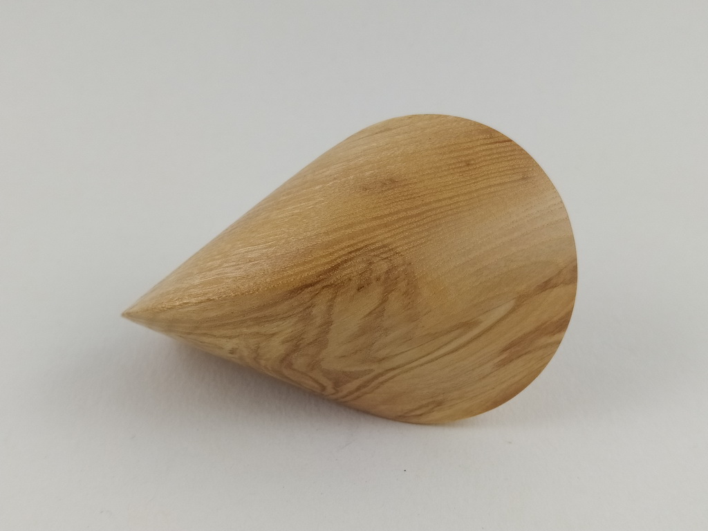 Dieses Eschenholzoloid ist ein Unikat. Verkauft wird genau das auf den Bildern gezeigte Oloid. Es wurde in mühevoller Handarbeit aus einem ganz besonderen Stück Eschenholz herausgearbeitet. Von groben Holzarbeiten mit der Säge weiter über verschiedene Schleifvorgänge bis hin zu einem Endschliff  mit einer 1000er Körnung erfolgte das Finish mit dem Polierfilz. Für den Schutz werden ein Naturöl und Hartwachs verwendet.