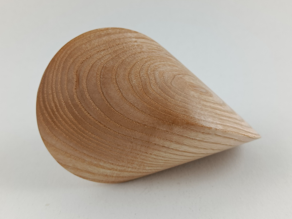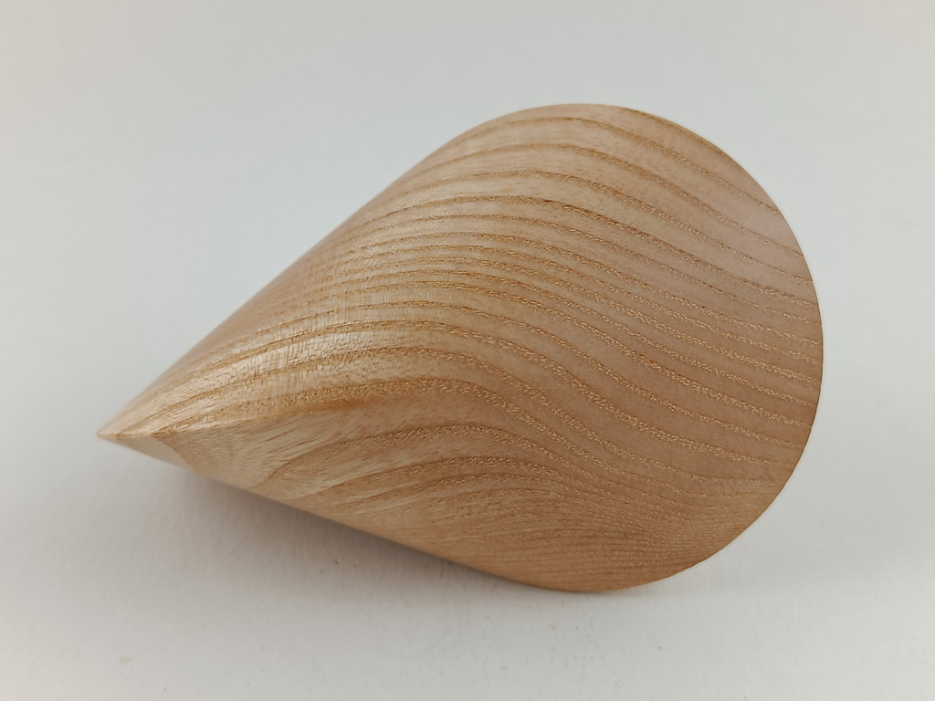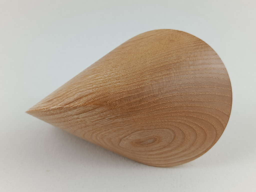 Dieses Eschenholzoloid ist ein Unikat. Verkauft wird genau das auf den Bildern gezeigte Oloid. Es wurde in mühevoller Handarbeit aus einem ganz besonderen Stück Eschenholz herausgearbeitet. Von groben Holzarbeiten mit der Säge weiter über verschiedene Schleifvorgänge bis hin zu einem Endschliff mit einer 1000er Körnung erfolgte das Finish mit dem Polierfilz. Für den Schutz werden ein Naturöl und Hartwachs verwendet.
