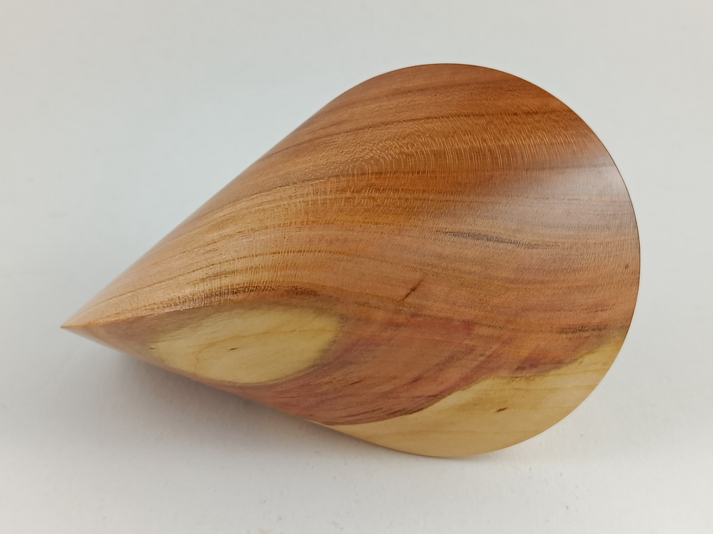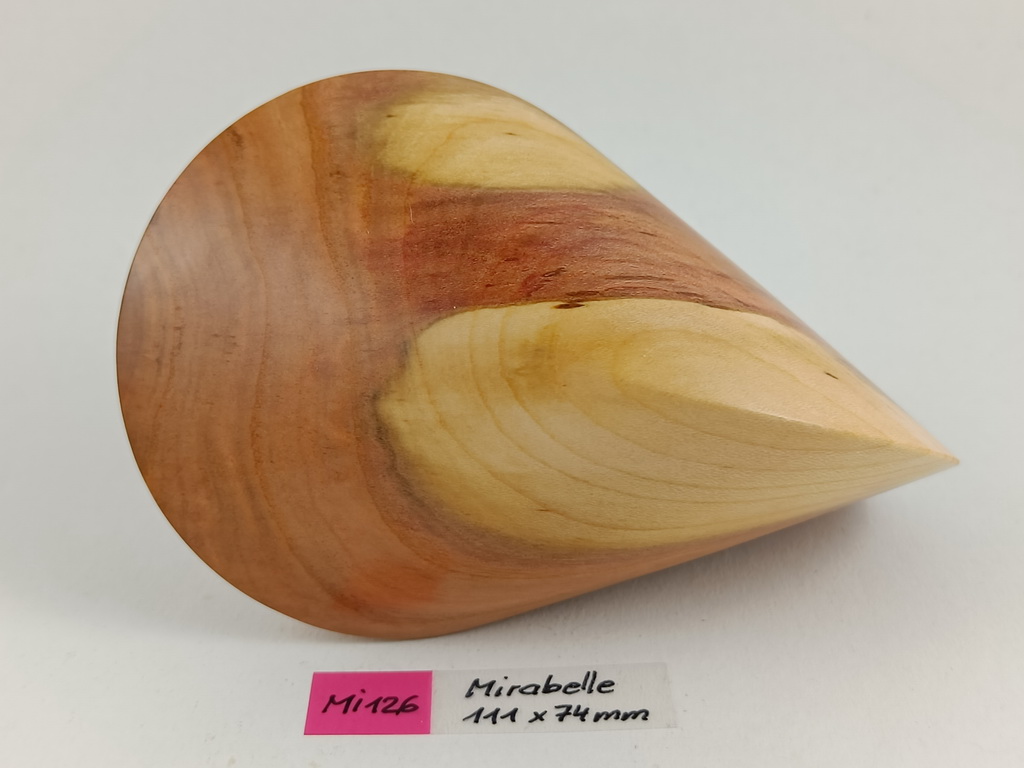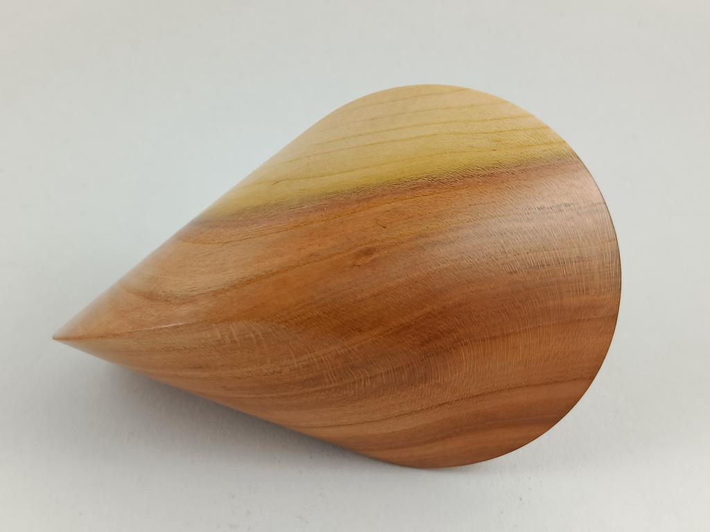 Dieses Mirabellenholzoloid ist ein Unikat. Verkauft wird genau das auf den Bildern gezeigte Oloid. Es wurde in mühevoller Handarbeit aus einem ganz besonderen Stück Mirabellenholz herausgearbeitet. Von groben Holzarbeiten mit der Säge weiter über verschiedene Schleifvorgänge bis hin zu einem Endschliff mit einer 1000er Körnung erfolgte das Finish mit dem Polierfilz. Für den Schutz werden ein Naturöl und Hartwachs verwendet.