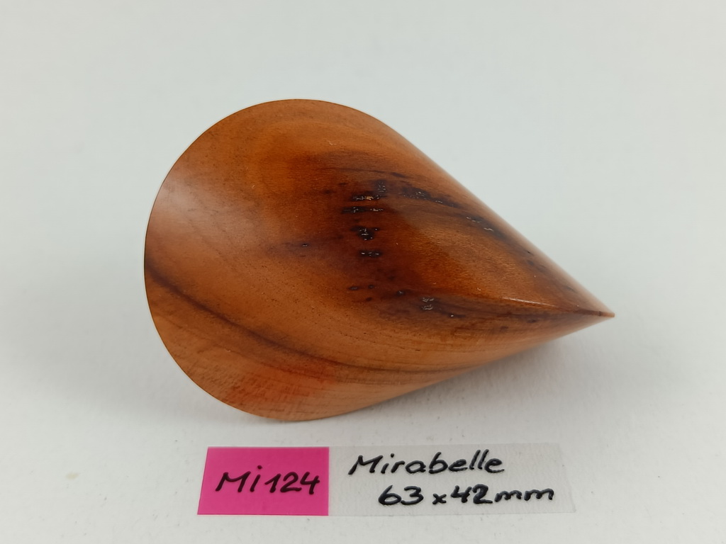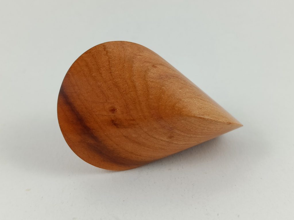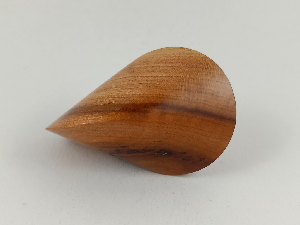 Dieses Mirabellenholzoloid ist ein Unikat. Verkauft wird genau das auf den Bildern gezeigte Oloid. Es wurde in mühevoller Handarbeit aus einem ganz besonderen Stück Mirabellenholz herausgearbeitet. Von groben Holzarbeiten mit der Säge weiter über verschiedene Schleifvorgänge bis hin zu einem Endschliff mit einer 1000er Körnung erfolgte das Finish mit dem Polierfilz. Für den Schutz werden ein Naturöl und Hartwachs verwendet.