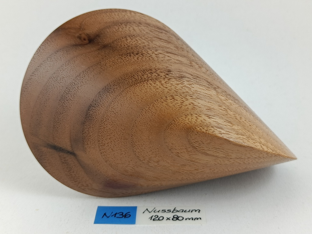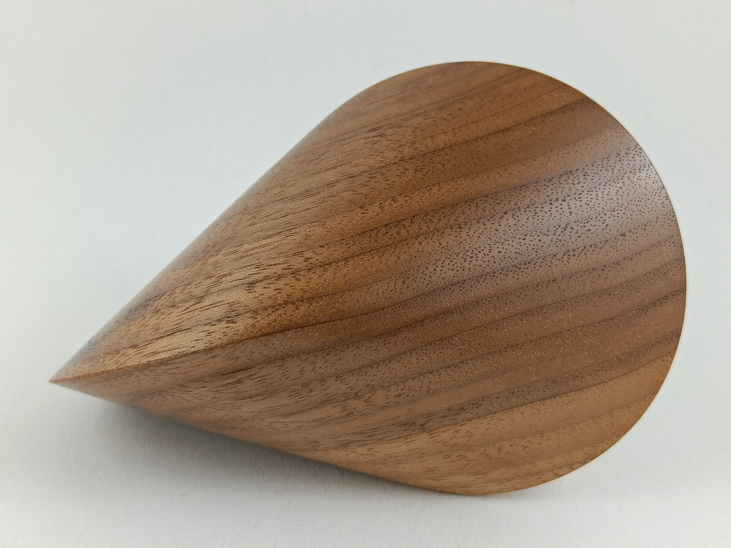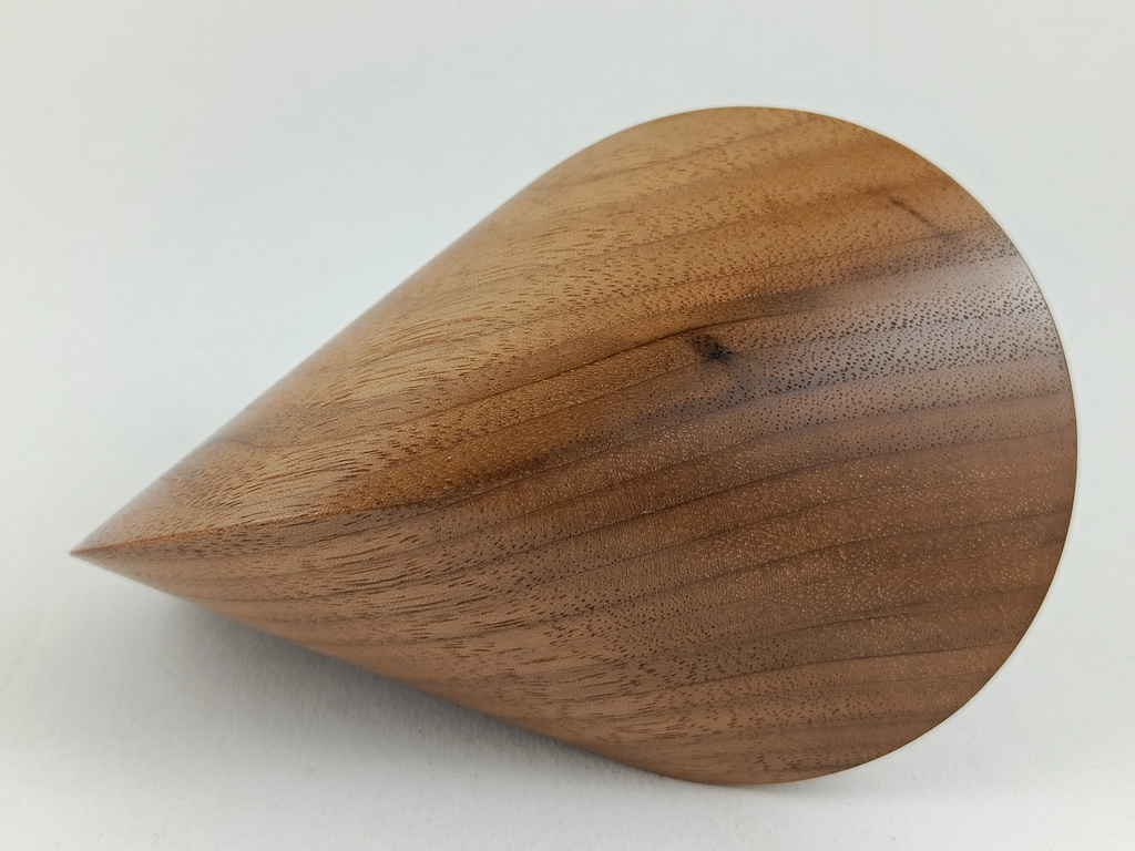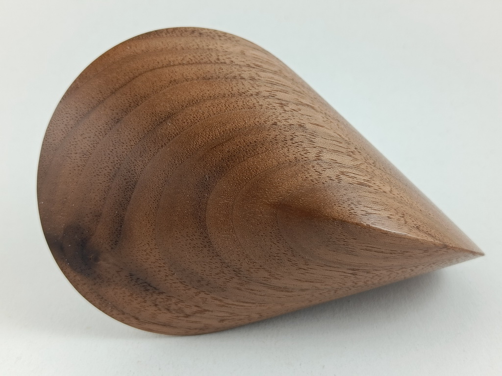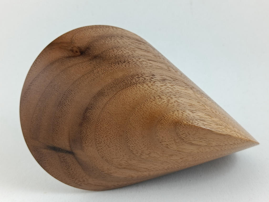 Dieses Nussbaumholzoloid ist ein Unikat. Verkauft wird genau das auf den Bildern gezeigte Oloid. Es wurde in mühevoller Handarbeit aus einem besonderen Stück Nussbaumholz herausgearbeitet. Von groben Holzarbeiten mit der Säge weiter über verschiedene Schleifvorgänge bis hin zu einem Endschliff mit einer 1000er Körnung erfolgte das Finish mit dem Polierfilz. Für den Schutz werden ein Naturöl und Hartwachs verwendet.