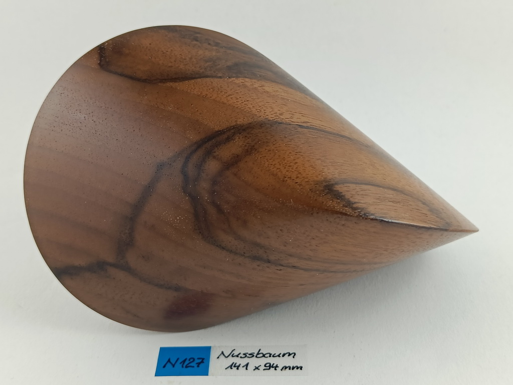 Dieses Nussbaumholzoloid ist ein Unikat. Verkauft wird genau das auf den Bildern gezeigte Oloid. Es wurde in mühevoller Handarbeit aus einem ganz besonderen Stück Amerikanischem Nussbaumholz herausgearbeitet. Von groben Holzarbeiten mit der Säge weiter über verschiedene Schleifvorgänge bis hin zu einem Endschliff mit einer 1000er Körnung erfolgte das Finish mit dem Polierfilz. Für den Schutz werden ein Naturöl und Hartwachs verwendet.