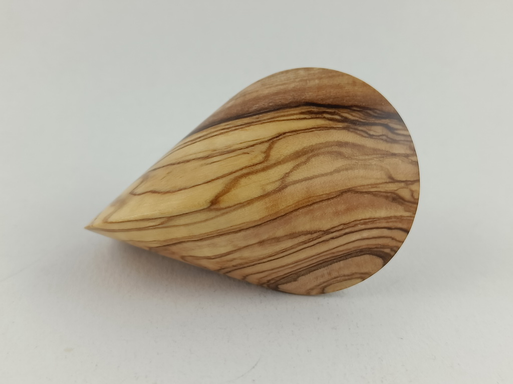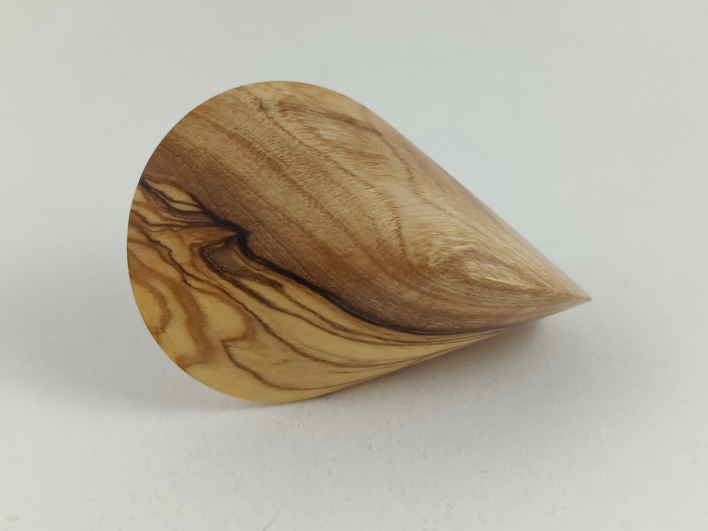 Dieses Olivenholzoloid ist ein Unikat. Verkauft wird genau das auf den Bildern gezeigte Oloid. Es wurde in mühevoller Handarbeit aus einem ganz besonderen Stück Olivenholz herausgearbeitet. Von groben Holzarbeiten mit der Säge weiter über verschiedene Schleifvorgänge bis hin zu einem Endschliff mit einer 1000er Körnung erfolgte das Finish mit dem Polierfilz. Für den Schutz werden ein Naturöl und Hartwachs verwendet.