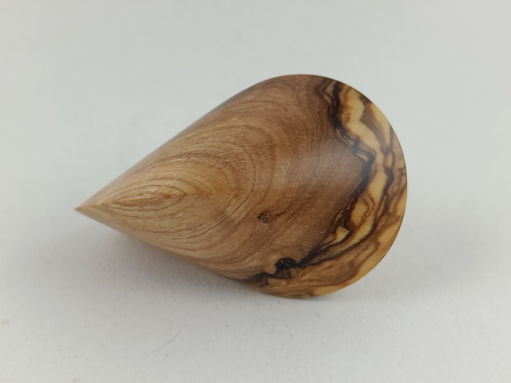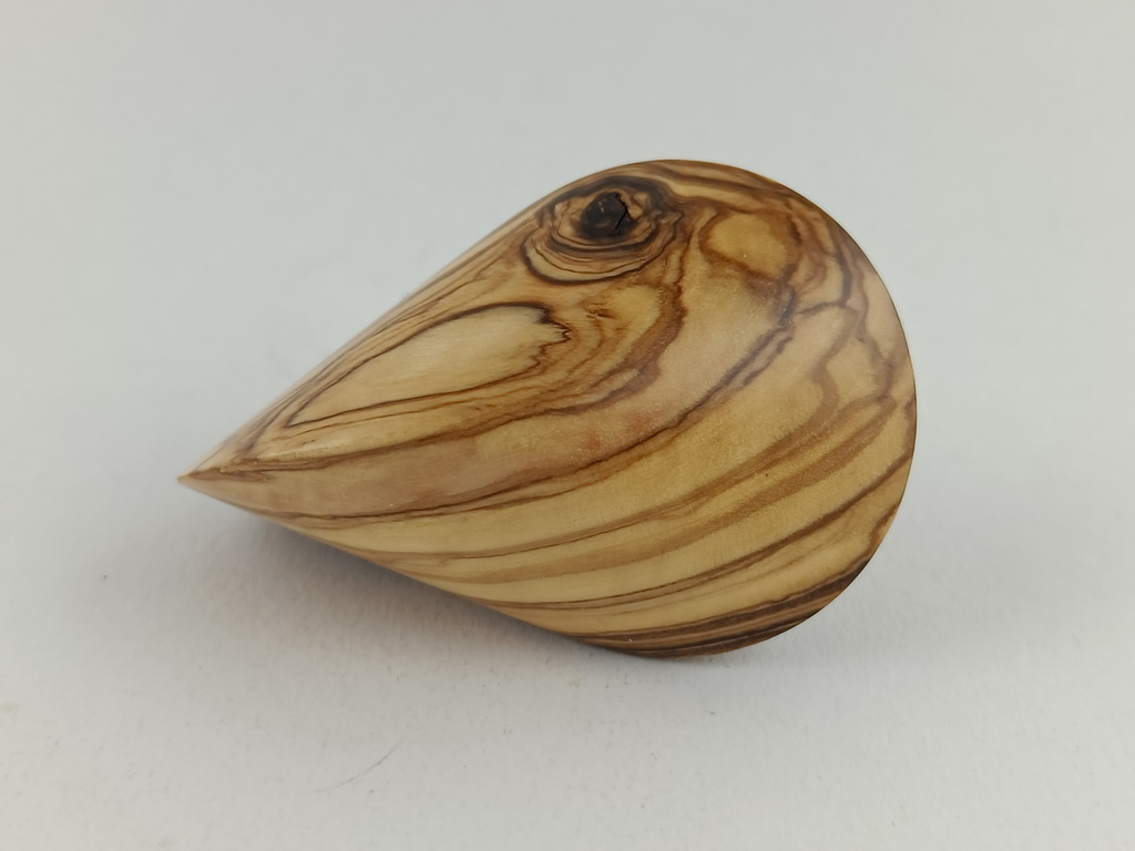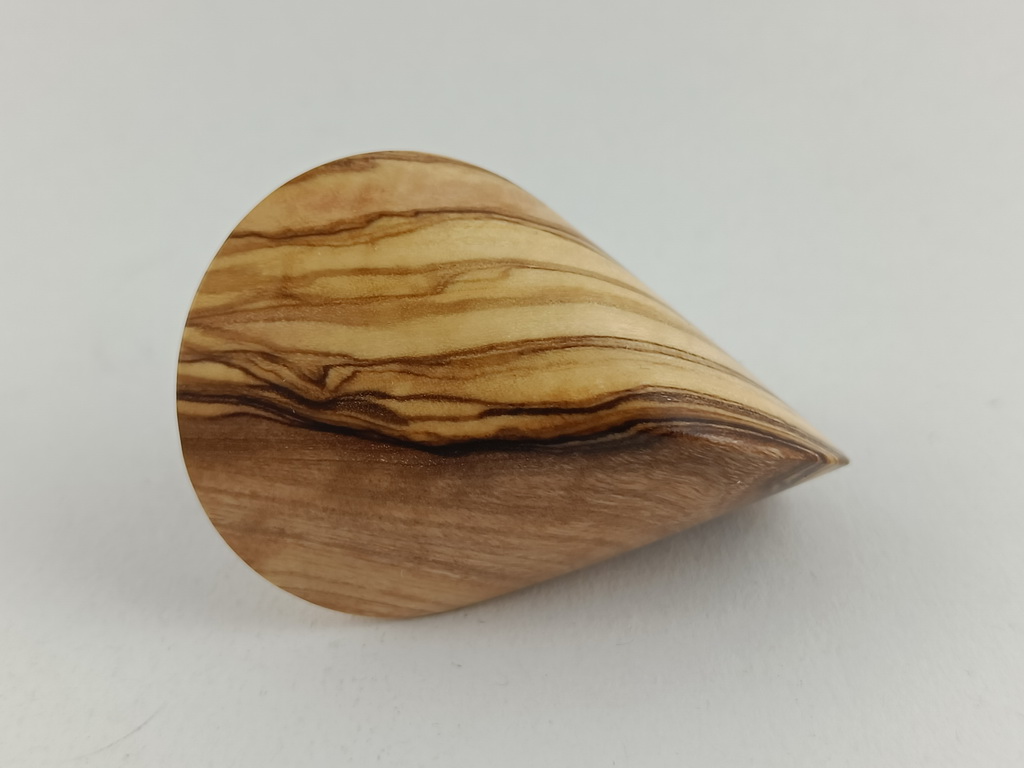 Dieses Olivenholzoloid ist ein Unikat. Verkauft wird genau das auf den Bildern gezeigte Oloid. Es wurde in mühevoller Handarbeit aus einem ganz besonderen Stück Olivenholz herausgearbeitet. Von groben Holzarbeiten mit der Säge weiter über verschiedene Schleifvorgänge bis hin zu einem Endschliff mit einer 1000er Körnung erfolgte das Finish mit dem Polierfilz. Für den Schutz werden ein Naturöl und Hartwachs verwendet.