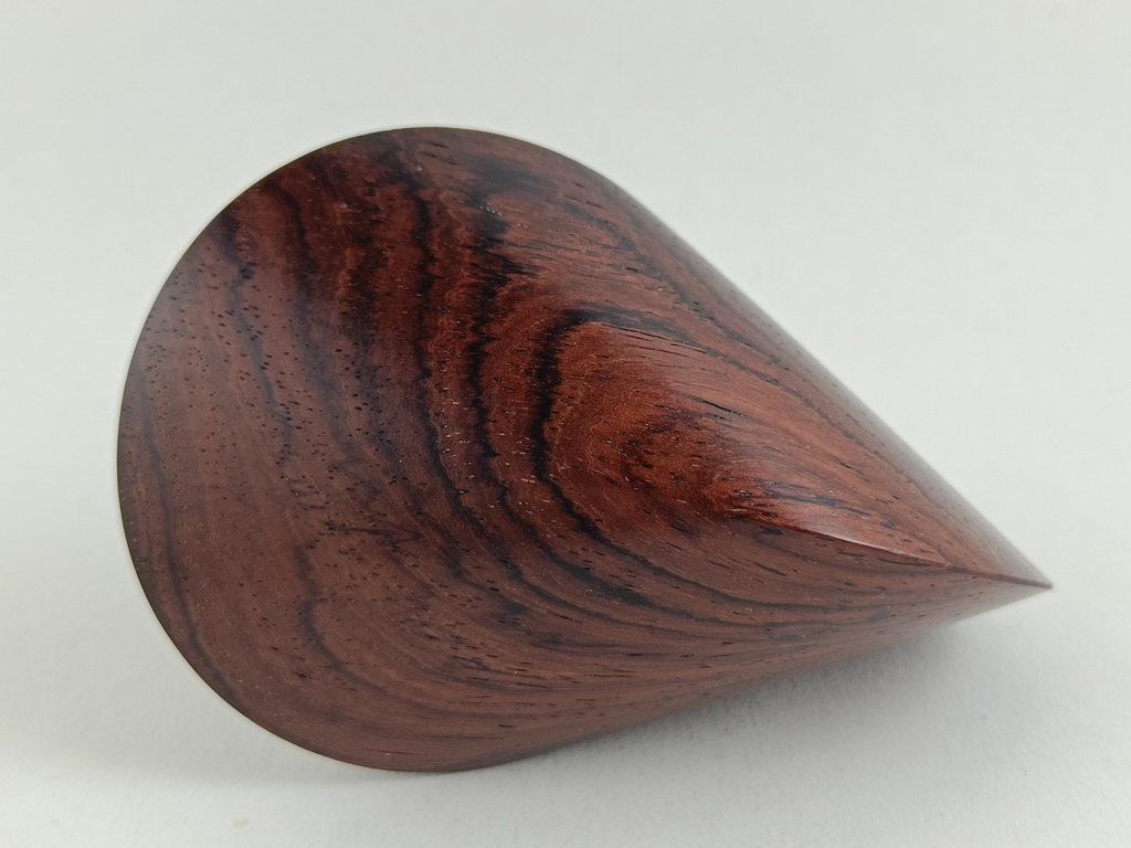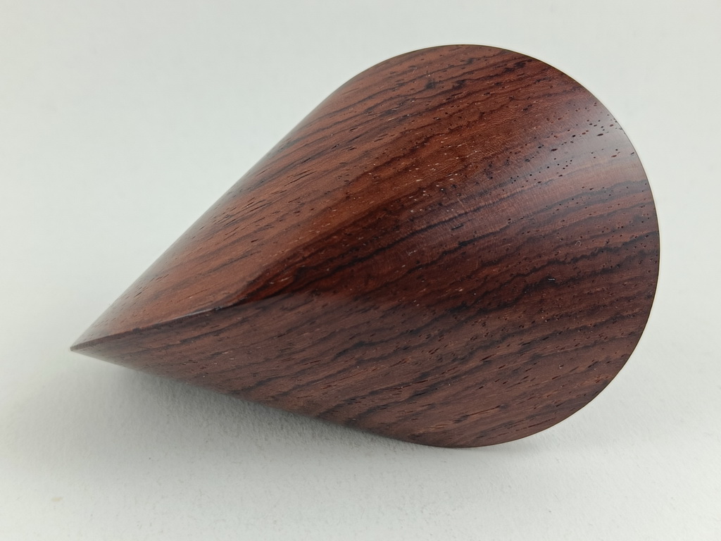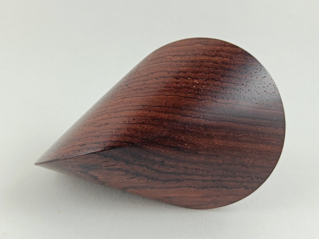 Dieses Palisanderholzoloid ist ein Unikat. Verkauft wird genau das auf den Bildern gezeigte Oloid. Es wurde in mühevoller Handarbeit aus einem ganz besonderen Stück Honduras Palisanderholz herausgearbeitet. Von groben Holzarbeiten mit der Säge weiter über verschiedene Schleifvorgänge bis hin zu einem Endschliff mit einer 1000er Körnung erfolgte das Finish mit dem Polierfilz. Für den Schutz werden ein Naturöl und Hartwachs verwendet.
