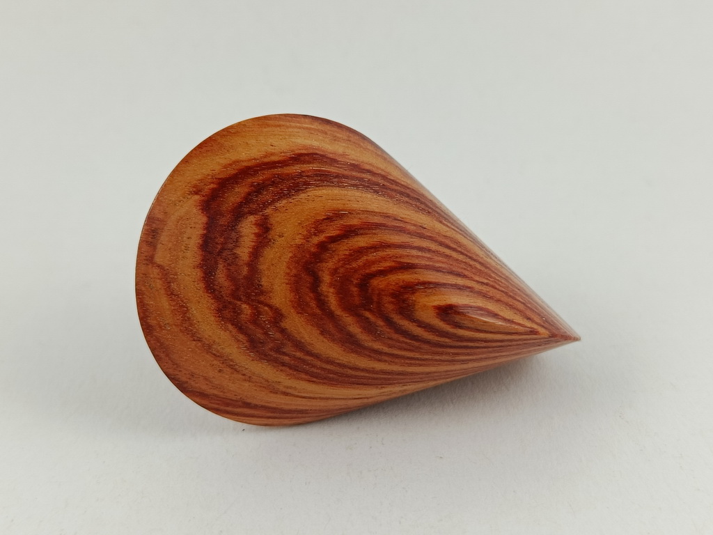 Dieses Rosenholzoloid ist ein Unikat. Verkauft wird genau das auf den Bildern gezeigte Oloid. Es wurde in mühevoller Handarbeit aus einem besonderen Stück Bahia-Rosenholz herausgearbeitet. Von groben Holzarbeiten mit der Säge weiter über verschiedene Schleifvorgänge bis hin zu einem Endschliff mit einer 1000er Körnung erfolgte das Finish mit dem Polierfilz. Für den Schutz werden ein Naturöl und Hartwachs verwendet.
