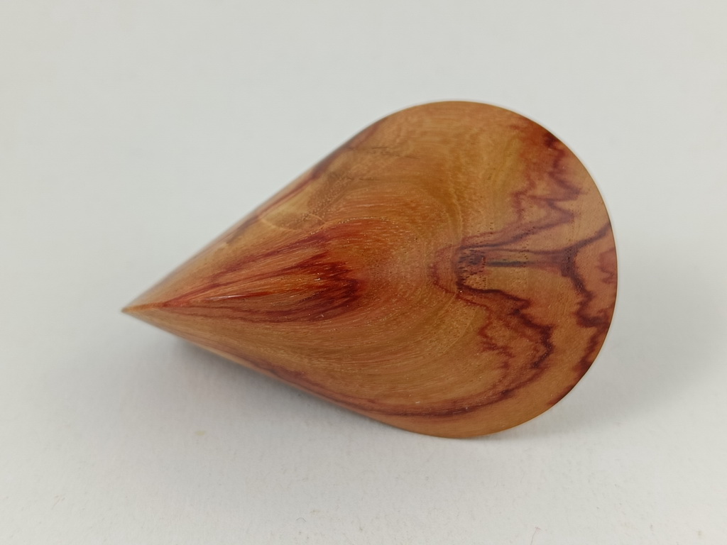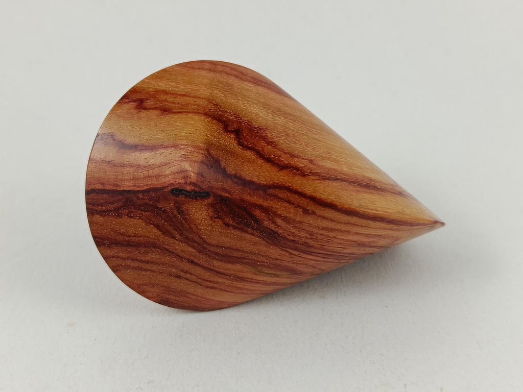 Das oben gezeigte Oloid ist ein Einzelstück und kann wegen der einzigartigen Merkmale des Holzes nur einmal in dieser abgebildeten Art hergestellt und verkauft werden. Die Fehlstelle wurde wegen ihrer Festigkeit und Klarheit nicht stabilisiert und in ihrer Natürlichkeit belassen.