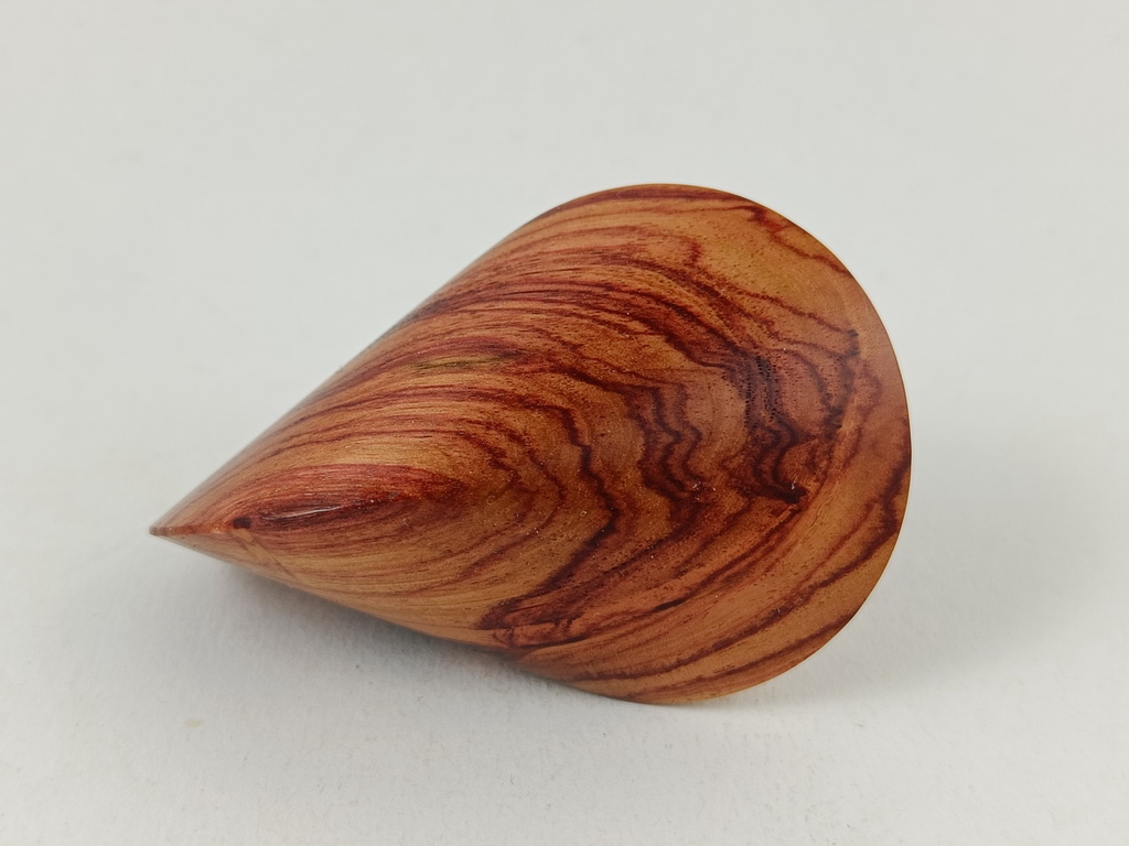 Dieses Rosenholzoloid ist ein Unikat. Verkauft wird genau das auf den Bildern gezeigte Oloid. Es wurde in mühevoller Handarbeit aus einem ganz besonderen Stück Bahia-Rosenholz herausgearbeitet. Von groben Holzarbeiten mit der Säge weiter über verschiedene Schleifvorgänge bis hin zu einem Endschliff mit einer 1000er Körnung erfolgte das Finish mit dem Polierfilz. Für den Schutz werden ein Naturöl und Hartwachs verwendet.
